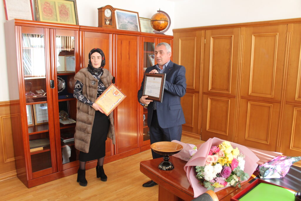 В рамках мероприятия исполняющий обязанности главы муниципалитета вручил Айшат Идрисовой памятный подарок работы Унцукульских мастеров и почетную грамоту от администрации района, а также благодарственное письмо от Председателя Народного Собрания республики Хизри Исаевича Шихсаидова.